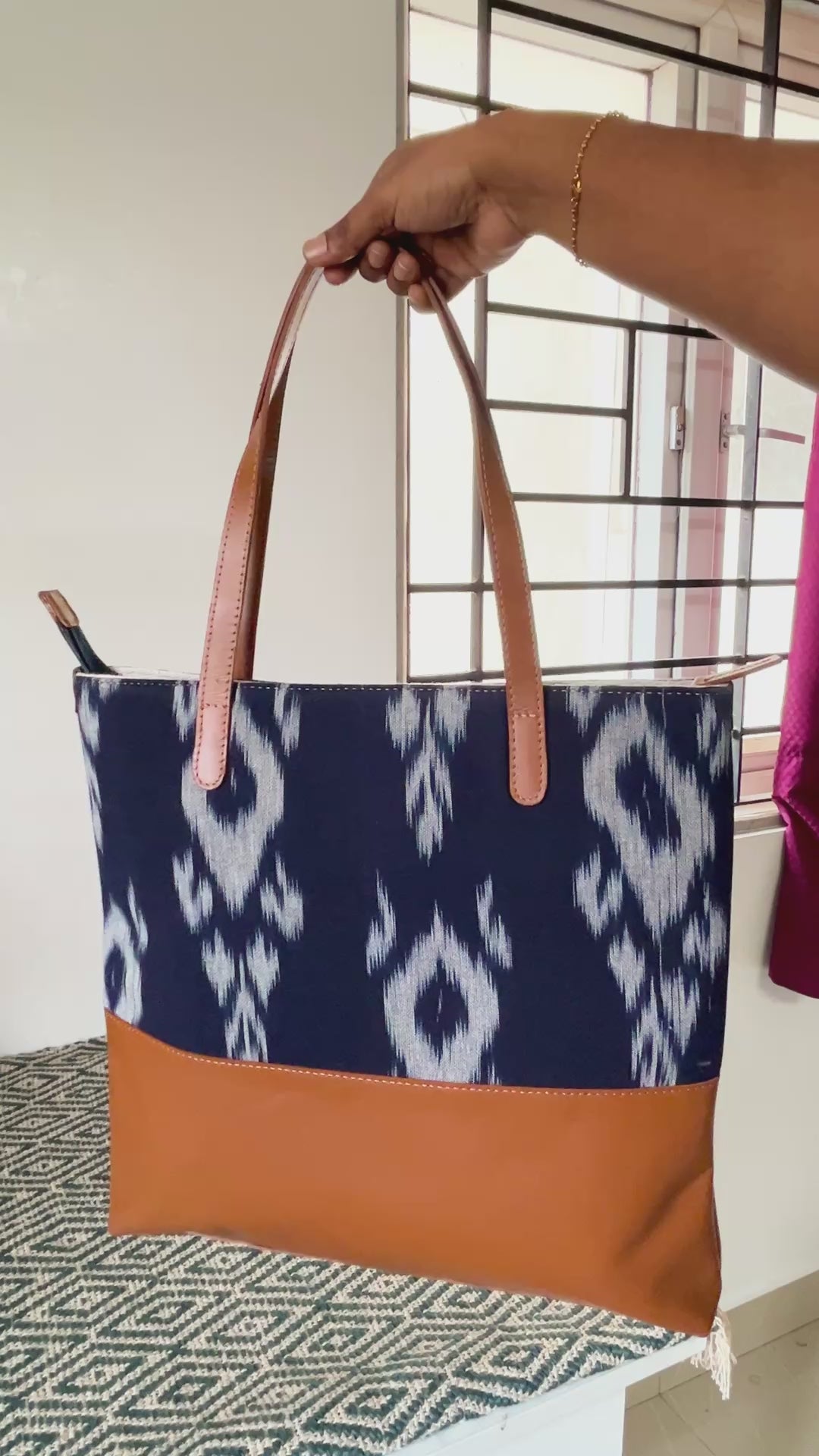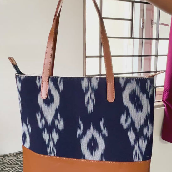 Discover the perfect blend of tradition and modern style with our Ikat tote bag. Featuring a striking black and white Ikat pattern complemented by rich brown leather accents, this tote is designed for versatility and elegance. Spacious enough for daily essentials, including a laptop, it’s ideal for work, casual outings, or weekend adventures. With its durable construction and comfortable leather handles, this bag offers both functionality and fashion, making it an essential addition to your wardrobe. Embrace the artistry of Indian handloom fabrics with a tote that celebrates timeless elegance.